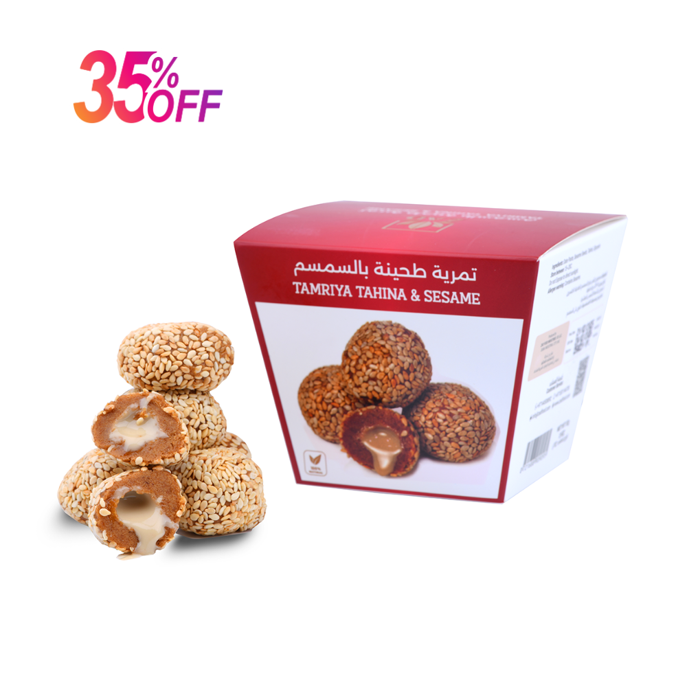 استمتع بمزيجنا الغني من معجون التمر وبذور السمسم والطحينة في تمرية الطحينة والسمسم. هذه الحلوى الطبيعية بالكامل والخالية من منتجات الألبان، خالية من السكر المضاف، والألوان، والنكهات الاصطناعية، والمواد الحافظة. صُنعت بفخر في الإمارات العربية المتحدة، لتقدم لك تجربة وجبة خفيفة صحية.