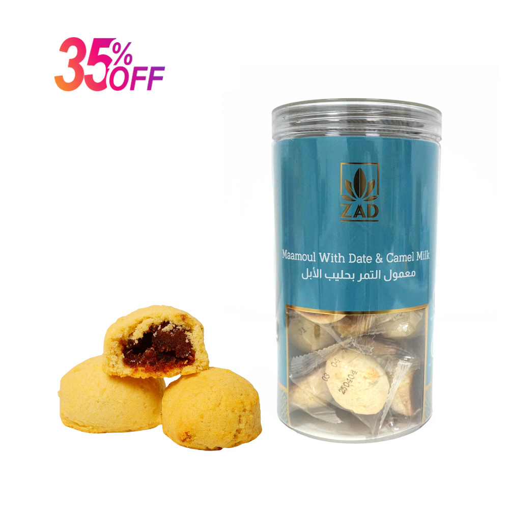 استمتع بطعم المعمول بالتمر وحليب الإبل الرائع، المصنوع من أجود المكونات لتجربة سناك فاخرة بكل معنى الكلمة. مصنوع من معجون التمر الفاخر، يمنحك دفعة طاقة طبيعية مع كل قضمة. مثالي كهدية مميزة، استمتع بلحظة من المتعة مع كل قضمة.